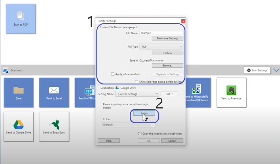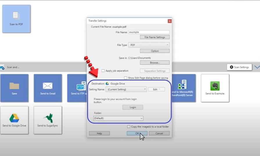 Bước 3: Bấm Send to Google Drive. Sau đó, chỉnh thông số ở phần 1 cho phù hợp và bấm Login ở phần 2.