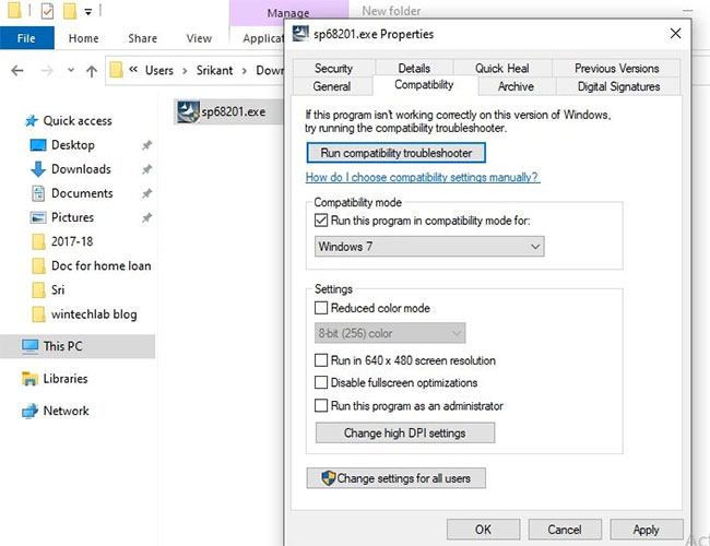 - Chọn Run this program in Compatibility mode for trong tab Compatibility.