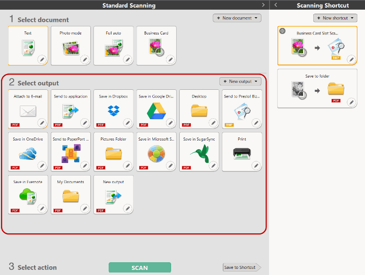 - Quét trực quan: Hoạt động dựa trên biểu tượng đơn giản. Lựa chọn quét 3 bước, các phím tắt có thể định cấu hình cho các tác vụ được thực hiện thường xuyên hoặc thao tác thông qua các nút trên bảng điều khiển của máy quét của bạn.