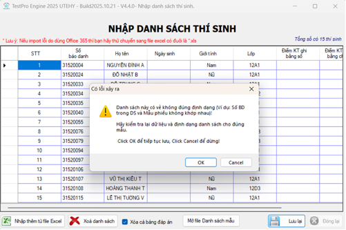 – Do danh sách thí sinh đang sử dụng có cấu trúc khác với danh sách thí sinh của phần mềm