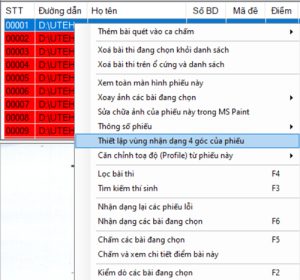 – Nhấp chuột phải vào 1 bài bất kỳ chọn Thiết lập vùng nhận dạng 4 góc của phiếu -> Căn chỉnh cùng nhận dạng vào 4 chốt ở 4 góc của phiếu