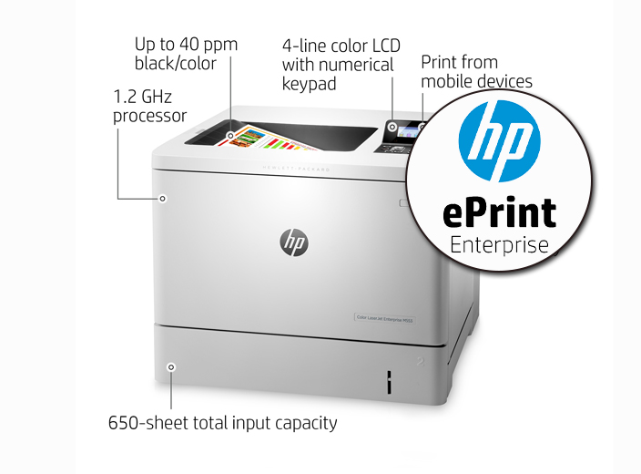 - Khả năng đáng nể của ePrint hỗ trợ máy in HP M553dn in nhiều loại định dạng dữ liệu khác nhau như các tập tin văn bản (PDF, Word, Excel, Outlook, txt) hay hình ảnh (png, jpg, gif, tiff). Với ePrint, người dùng có thể ra lệnh in từ bất kì đâu ngay cả khi ở nhà hay đang đi du lịch vẫn có thể in máy trên văn phòng.