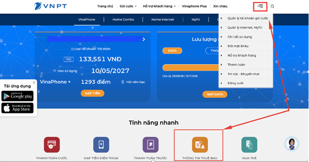 – Sau khi đăng nhập, khách hàng chọn mục “Thông tin thuê bao” hoặc chọn Menu/Quản lý tài khoản gói cước Thông tin cá nhân.