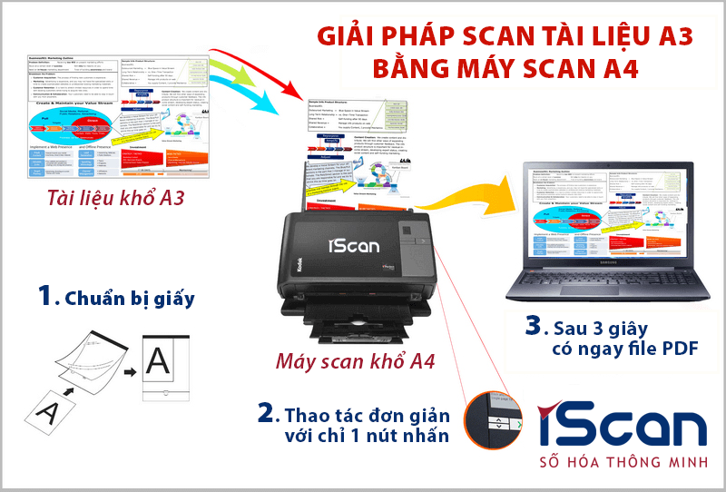 Giải pháp của iScan đưa ra là dùng máy scan khổ A4 nhưng có thể scan được cả tài liệu khổ A3. Nguyên tắc hoạt động của giải pháp là tận dụng tính năng scan 2 mặt của máy scan và ghép 2 ảnh lại với nhau thành 01 ảnh khổ A3.