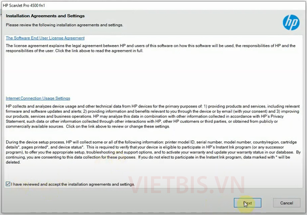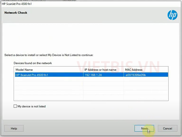 - Khi đã lựa chọn xong thì phần mềm sẽ tự động dò tìm máy scan bạn. Chọn tên máy scan HP 4500 fn1 > Ấn Next