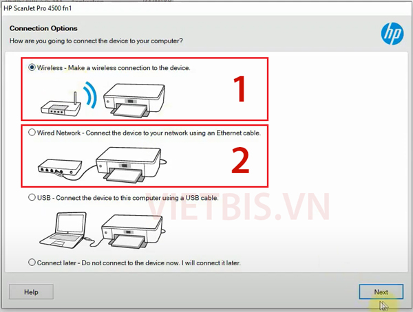 1, Kết nối mạng Wifi: Nếu máy scan HP 4500 fn1 của bạn đang kết nối mạng Wifi thì bạn tích chọn vào lựa chọn thứ nhất.