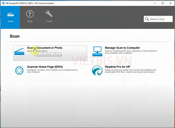 - Khi cần tạo lệnh scan, bạn hãy nhấn vào biểu tượng máy scan HP ScanJet Pro 4500 fn1 trên màn hình > Chọn Scan a Document or Photo.