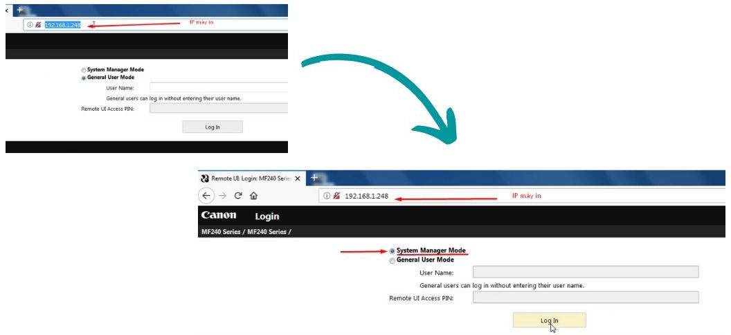- Bước 1: Vào trình duyệt web, nhập IP máy in → Chọn Login bằng chế độ System Manager Mode