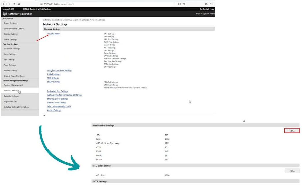 - Bước 1: Bạn vào lại phần Network Settings → chọn TCP/IP Settings, kéo xuống chọn Port Number Settings → Edit