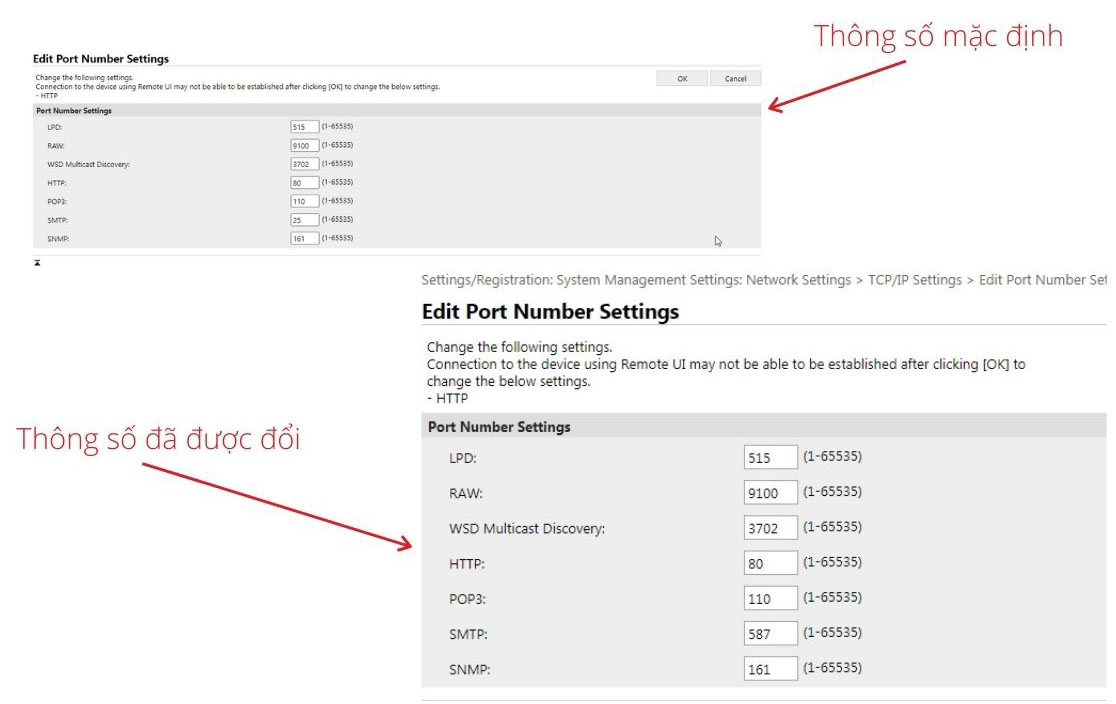 Tiếp theo là các bước điều chỉnh port. Đối với những tên miền công ty, sử dụng port mặc định smtp:25 thì không cần đổi port. Nếu sử dụng gmail để thiết lập mail gửi thì phải đổi port máy in sang port smtp của gmail.