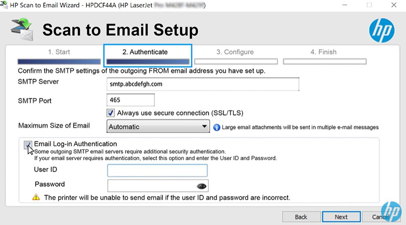 10. Nếu máy chủ SMTP yêu cầu xác thực để gửi một email, chọn hộp kiểm Email Log-in Authentication (Xác thực đăng nhập email), sau đó nhập User ID (ID người dùng) và Password (Mật khẩu) và bấm Next (Tiếp).