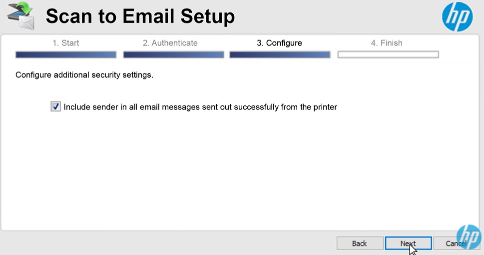 11. Trên 3. trang Configure (Cấu hình), để tự động sao chép người gửi trên các email gửi từ cấu hình, chọn Include sender in all email messages sent out successfully from the printer (Bao gồm người gửi trong tất cả email được gửi đi thành công từ máy in), sau đó bấm Next (Tiếp).