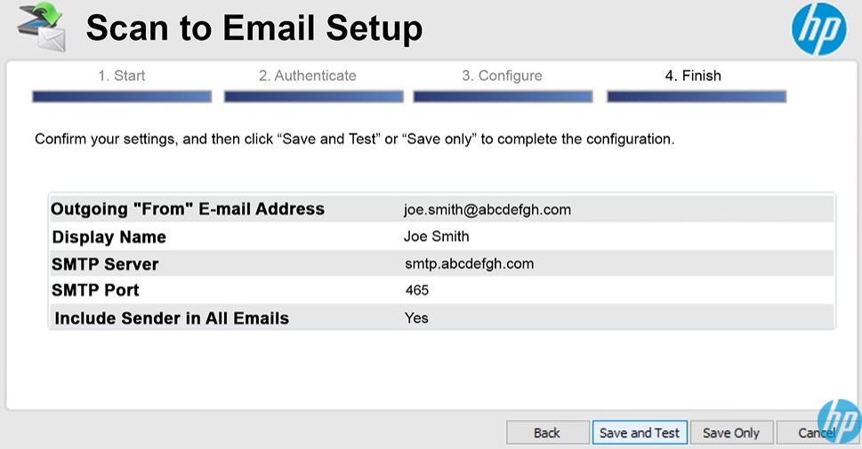 12. Trên 4. trang Finish (Kết thúc), xem lại thông tin và xác nhận tất cả các cài đặt là chính xác. Nếu có lỗi, hãy nhấp nút Back (Quay lại) để sửa lỗi đó. Nếu các cài đặt đã đúng, bấm nút Save and Test (Lưu và kiểm tra) để kiểm tra cấu hình.