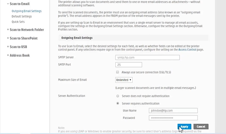 - Nếu văn phòng bạn sử dụng nhiều máy chủ email cho email của văn phòng: Cài đặt địa chỉ email, tên và mã PIN bảo mật cho từng hồ sơ email. Nhấp vào Apply (Áp dụng). Sau khi hoàn tất các cài đặt email, EWS sẽ hiển thị tab Scan (Quét).