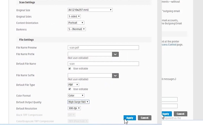 3. Tại Scan (Quét), nhấn Scan to Email (Quét và gửi qua email) và Default Settings (Cài đặt mặc định). Chọn các cài đặt mặc định quét và tập tin, sau đó nhấn Apply.