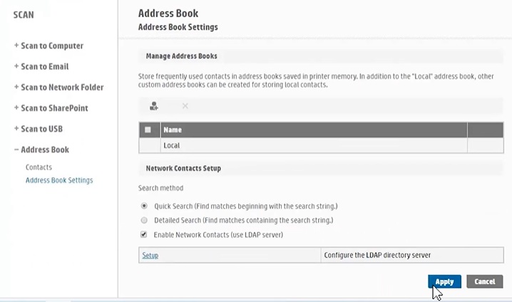 - Có thể cài đặt Network Directory Server (Máy chủ thư mục mạng) (LDAP) để tìm kiếm người dùng nằm trong phạm vi công ty. Nhấp vào Address Book Settings (Cài đặt sổ địa chỉ) để cấu hình LDAP.