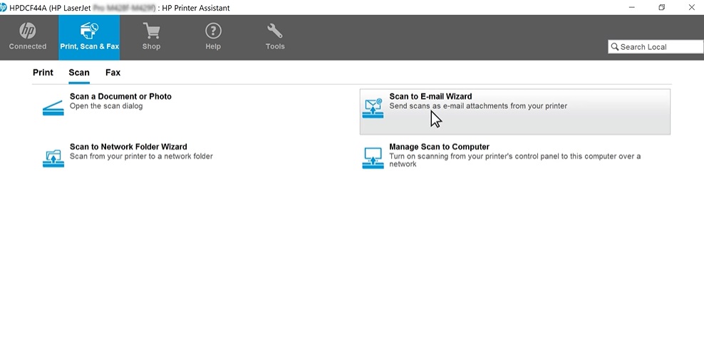 2. Trong HP Printer Assistant (Trợ lý máy in HP), chọn Scan (Quét) và chọn Scan to E-mail Wizard (Trình hướng dẫn Quét và gửi qua email).