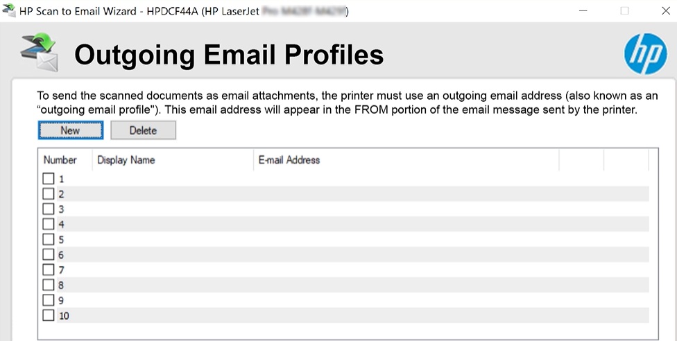 3. Trên trang Outgoing Email Profiles (Cấu hình email gửi đi), bấm nút New (Mới). Hộp thoại Scan to Email Setup (Cài đặt quét và gửi qua email) sẽ mở ra.