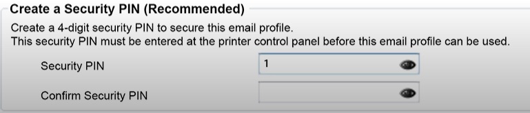 6. Để yêu cầu mã PIN để nhập trên bảng điều khiển máy in trước khi máy in có thể gửi một email, hãy nhập mã PIN gồm 4 chữ số vào trường Security PIN (Mã PIN bảo mật), sau đó nhập lại mã PIN trong trường Confirm Security PIN (Xác nhận mã PIN bảo mật), rồi bấm Next (Tiếp). iScan khuyên bạn nên tạo một mã PIN để bảo vệ cấu hình email. Khi mã PIN được tạo, nó phải được nhập trên bảng điều khiển máy in mỗi lần cấu hình được dùng để gửi bản quét qua email.