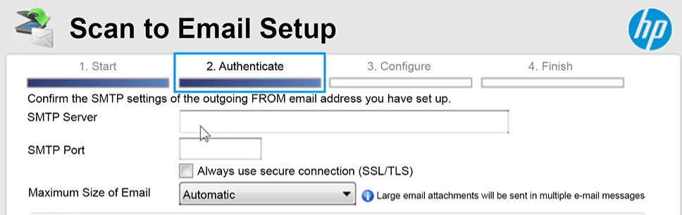 7. Trên 2. Authenticate (Xác thực), nhập tên SMTP Server (Máy chủ SMTP) và số SMTP Port (Cổng SMTP).