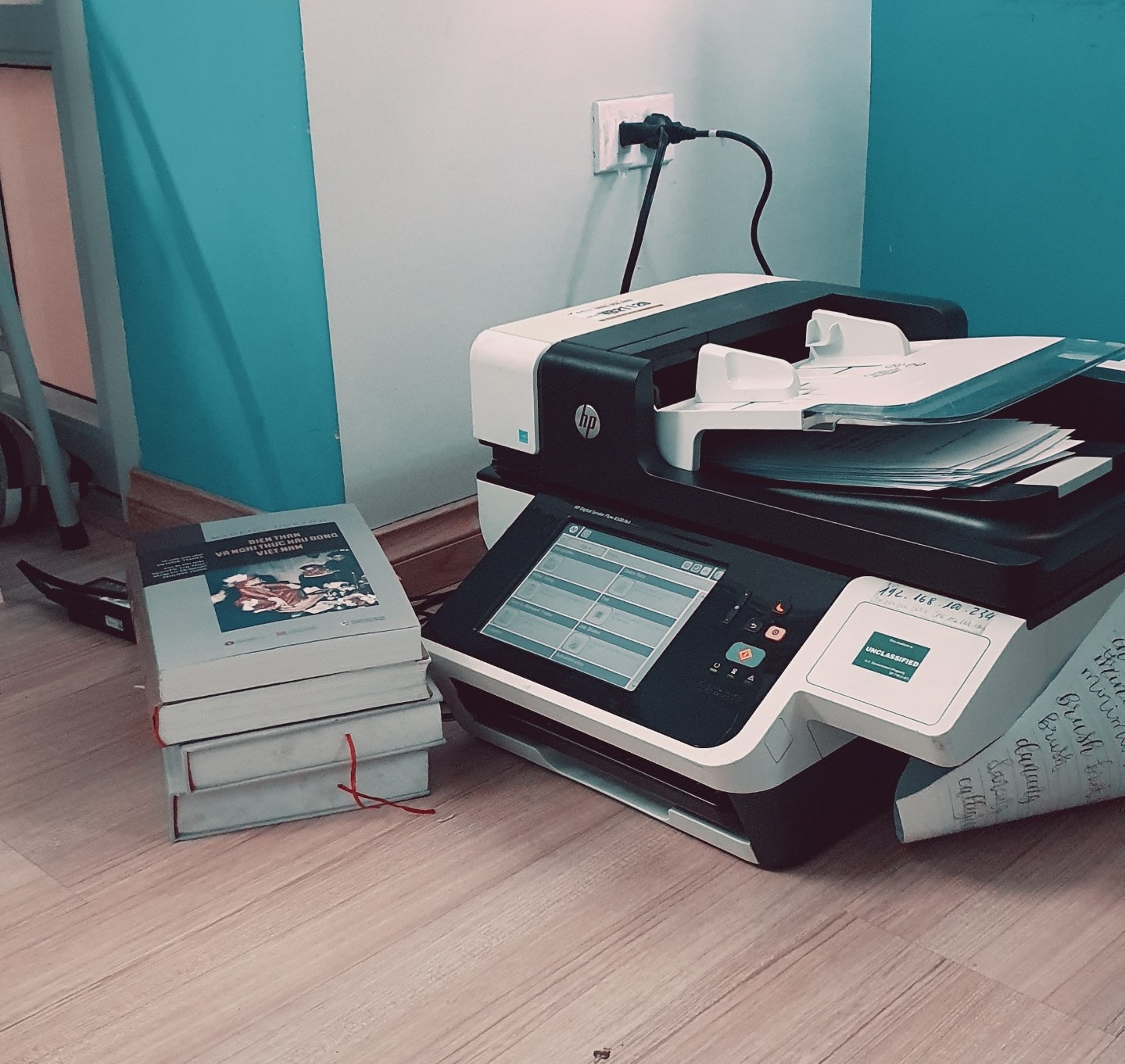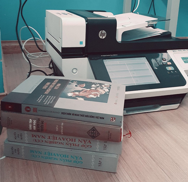 Chị Thanh Lê quyết định sử dụng loại máy scan nạp tài liệu tự động này để số hóa nhanh chóng tủ sách. Chị đã sử dụng máy cắt để loại bỏ toàn bộ gáy sách, chuyển thành các tập giấy có thể đưa vào máy scan tự động quét 2 mặt tài liệu. Sau đó những cuốn sách được đóng gáy đẹp như ban đầu. Bản file mềm cũng sẽ đẹp hơn so với scan mặt gương hoặc máy scan sách chuyên dụng.