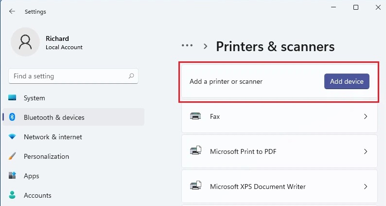 Bước 3. Click Add device bên phải mục Add a printer or scanner.