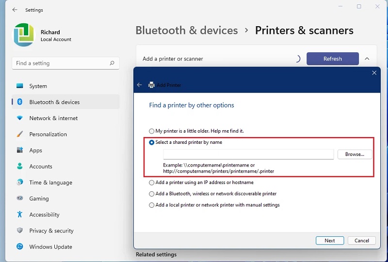Bước 5. Trong hộp thoại Add printer, hãy chọn Select a shared printer by name, sau đó nhập tên máy tính hoặc thiết bị có máy in và tên máy in được chia sẻ bằng một trong các định dạng sau: