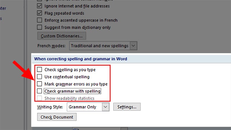 Bước 3. Click và chọn vào phía bên phải cửa sổ màn, tiến hành “Bỏ tích chọn” 5 mục tại “When correcting spelling and grammar in Word”.