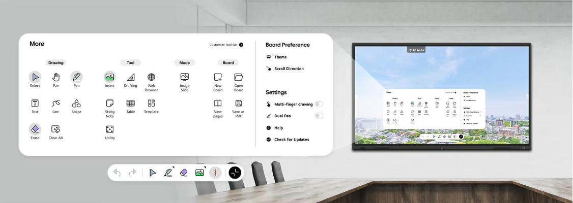 - Phần mềm bảng trắng độc quyền của LG: Có nhiều mẫu và công cụ giảng dạy khác nhau như thước kẻ, bảng và giấy ghi chú, thúc đẩy học sinh chủ động tham gia và tạo điều kiện cho các bài học trực quan.