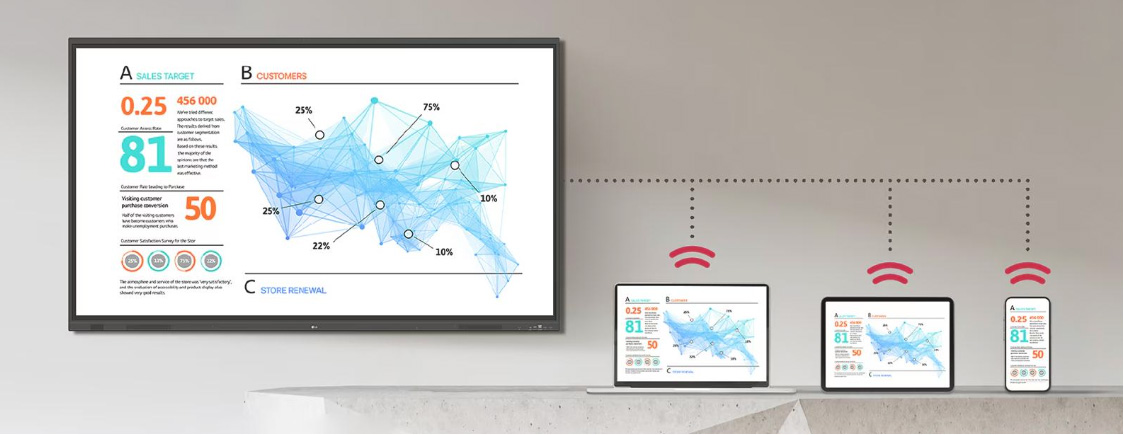 - LG CreateBoard Share: LG CreateBoard Share cung cấp tính năng chia sẻ màn hình không dây (lên đến 9 màn hình), mang đến cho người dùng môi trường thảo luận linh hoạt. Người dùng có thể chia sẻ màn hình của mình từ PC, máy tính bảng hoặc điện thoại thông minh, đơn giản hóa quy trình chia sẻ và cộng tác trong các dự án nhóm hoặc tài liệu thuyết trình.